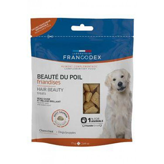 Przysmak Francodex Hair Beauty dla psów i szczeniąt zawiera zrównoważoną mieszankę niezbędnych kwasów tłuszczowych i witamin, które pomagają poprawić suchą, podrażnioną lub wrażliwą skórę.