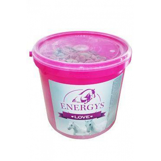 Przysmaki w kształcie serduszek o smaku jabłka, bez sztucznych barwników. Opis: Smaczne przekąski jabłkowe, o atrakcyjnym kształcie serduszek, w praktycznym wiaderku. Energys Love to zdrowa nagroda dla Twojego konia bez sztucznych barwników i sztucznych aromatów.